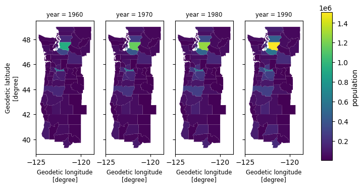 1# Efficient selection using shapely.STRtree 2from shapely.geometry import box 3 4subset = cube.xvec.query( 5 "county", 6 box(-125.4, 40, -120.0, 50), 7 predicate="intersects", 8) 9 10subset['population'].xvec.plot(col='year'); 11